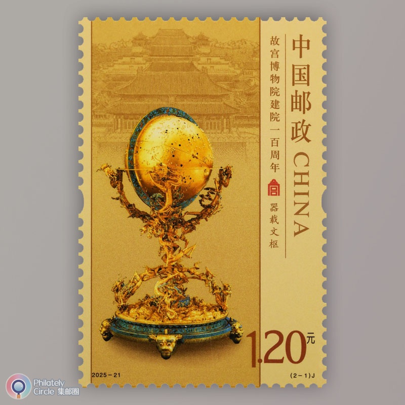 2025年10月10日发行《故宫博物院建院一百周年》纪念邮票1套2枚,邮票图案名称为:器载文枢、丹青永续。全套邮票面值2.40元,计划发行数量为套票490万套,版式二69.3万版。由尹晓飞设计,干止戈编辑,北京邮票厂有限公司胶印工艺印制。故宫博物院,成立于1925年10月10日,是在明清皇宫及其收藏基础上建立起来的集古代建筑群、宫廷收藏、历代文化艺术为一体的大型综合性博物馆。它是中华五千年文明的重要承载者,中华优秀传统文化的汇聚地。