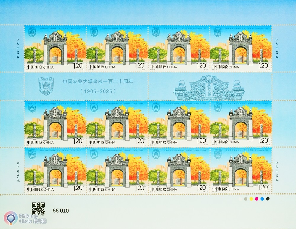 2025年10月16日发行《中国农业大学建校一百二十周年》纪念邮票1套1枚,邮票图案名称为:中国农业大学建校一百二十周年。全套邮票面值1.20元,计划发行数量为450万套。由徐喆设计,李金薇编辑,北京邮票厂有限公司胶雕套印工艺印制。邮票图案采用雕刻结合淡彩的方式绘制,以“农科大学”老校门为主体,并以现代化的校园风光画面适当装饰。本套邮票在雕刻者的刻画下,凸显出建筑几何造型的立体感和中轴对称的秩序感。背景采用高精度胶印,画面细腻,层次丰富。紫外灯照射下,“解民生之多艰,育天下之英才”的校训文字清晰可见。