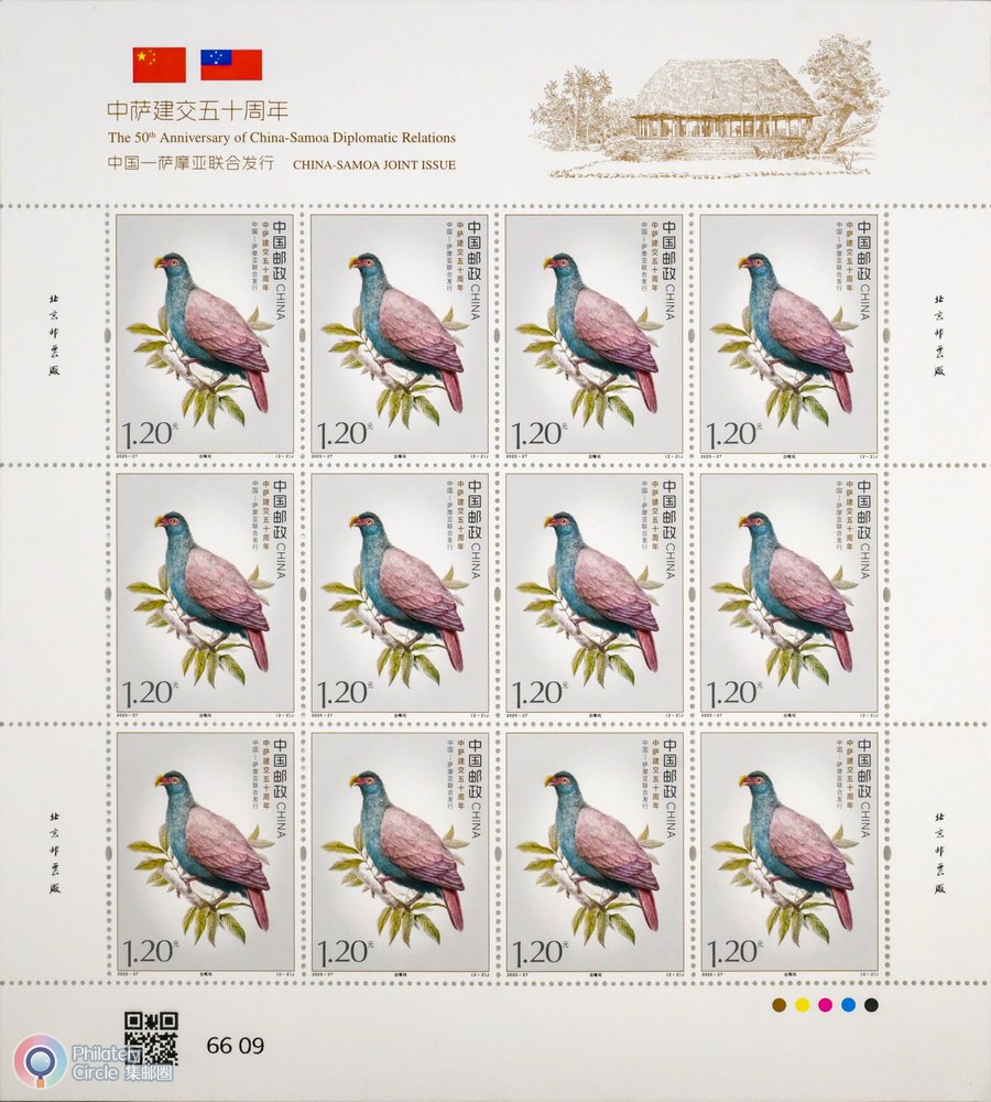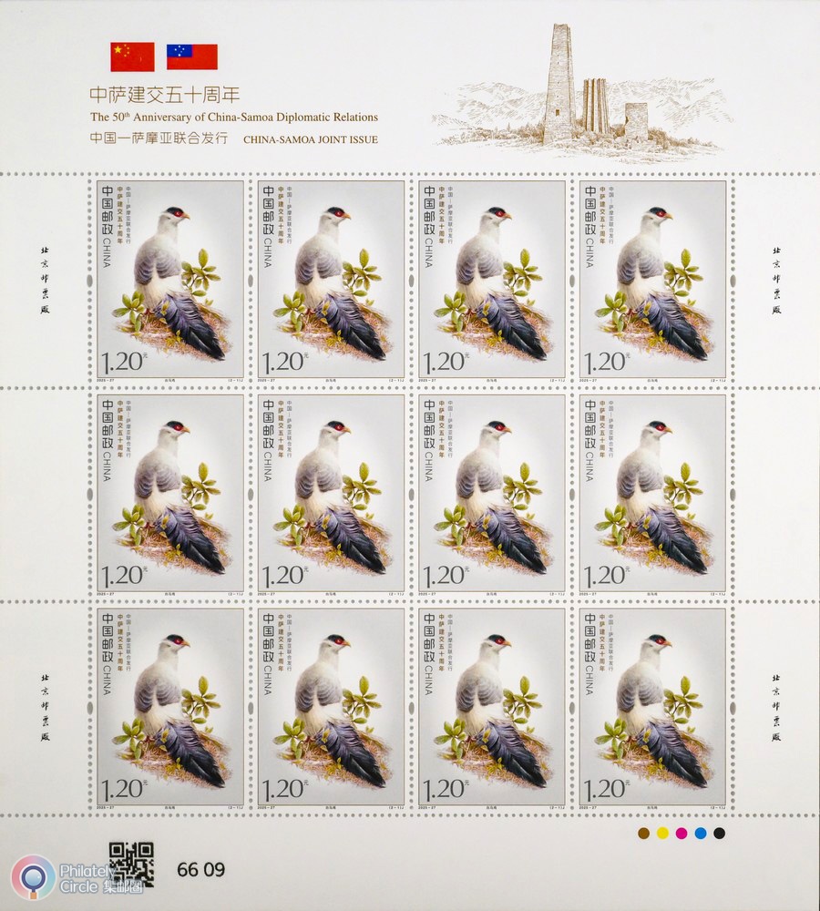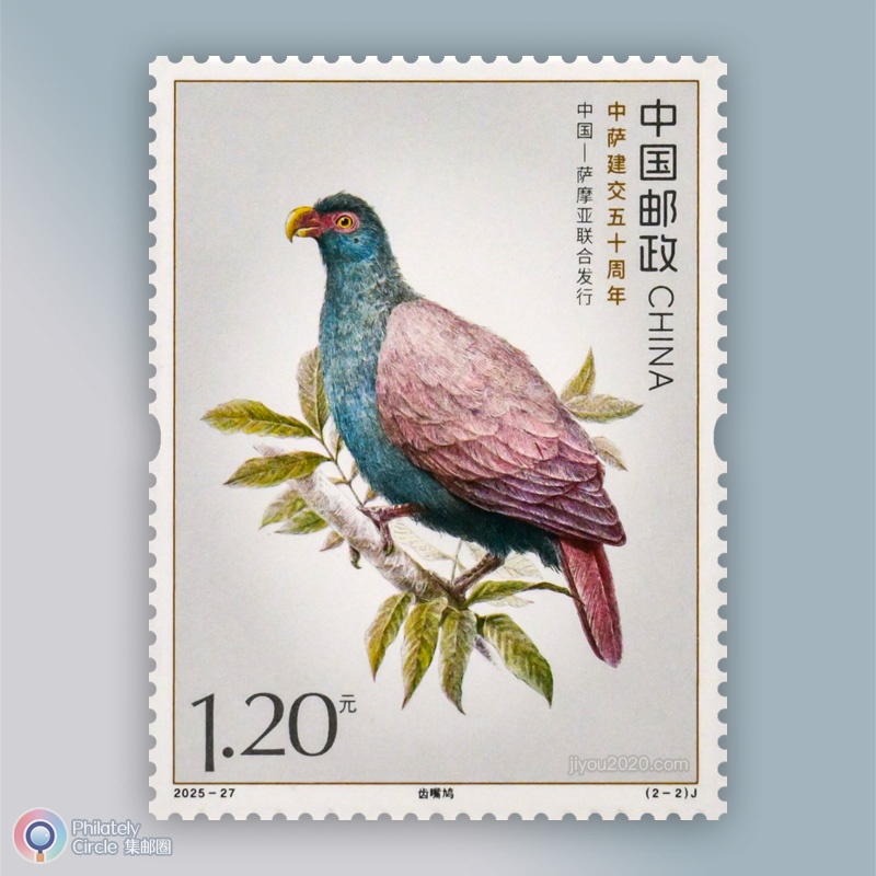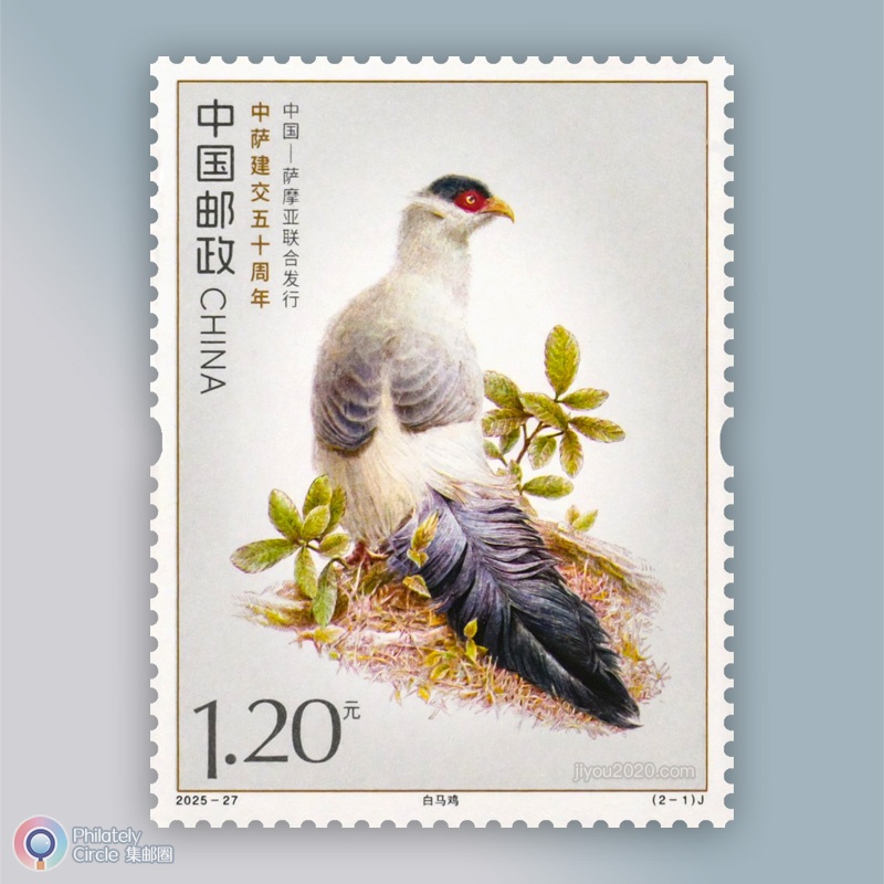 2025年11月6日发行《中萨建交五十周年》纪念邮票1套2枚,邮票图案名称分别为:白马鸡、齿嘴鸠。全套邮票面值2.40元,计划发行数量为450万套。由王国政设计,王楠编辑,北京邮票厂有限公司胶印工艺印制。萨摩亚是最早同新中国建交的太平洋岛国之一。建交五十年来,中萨保持传统友好,始终相互尊重、平等相待、合作共赢。