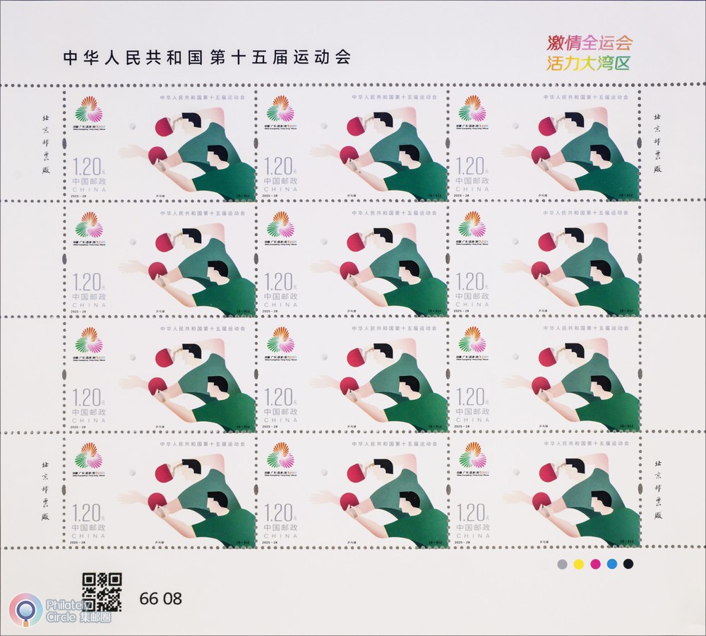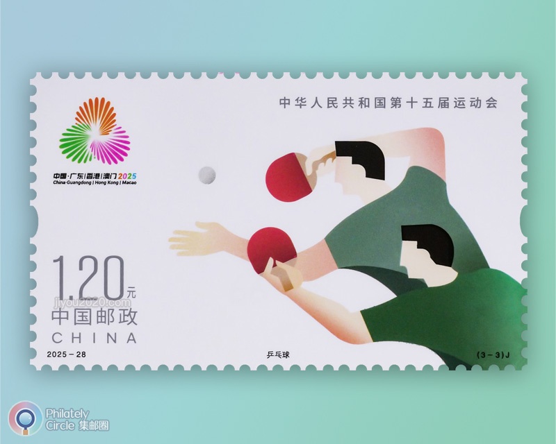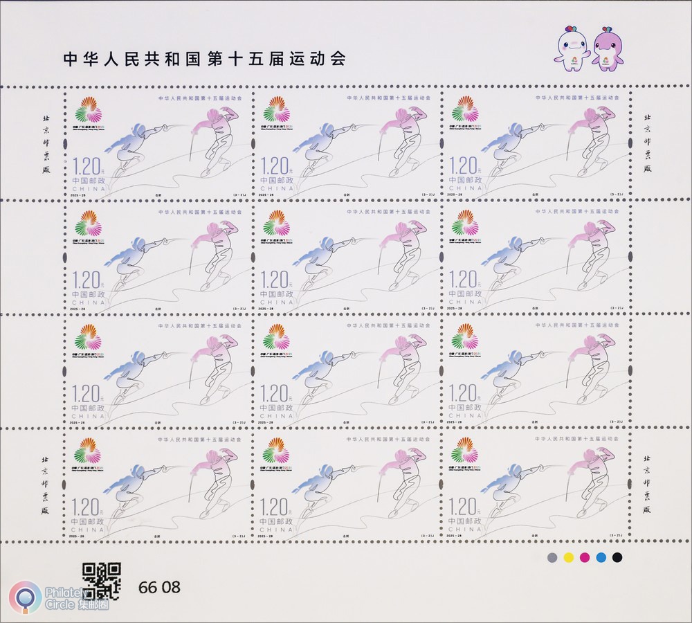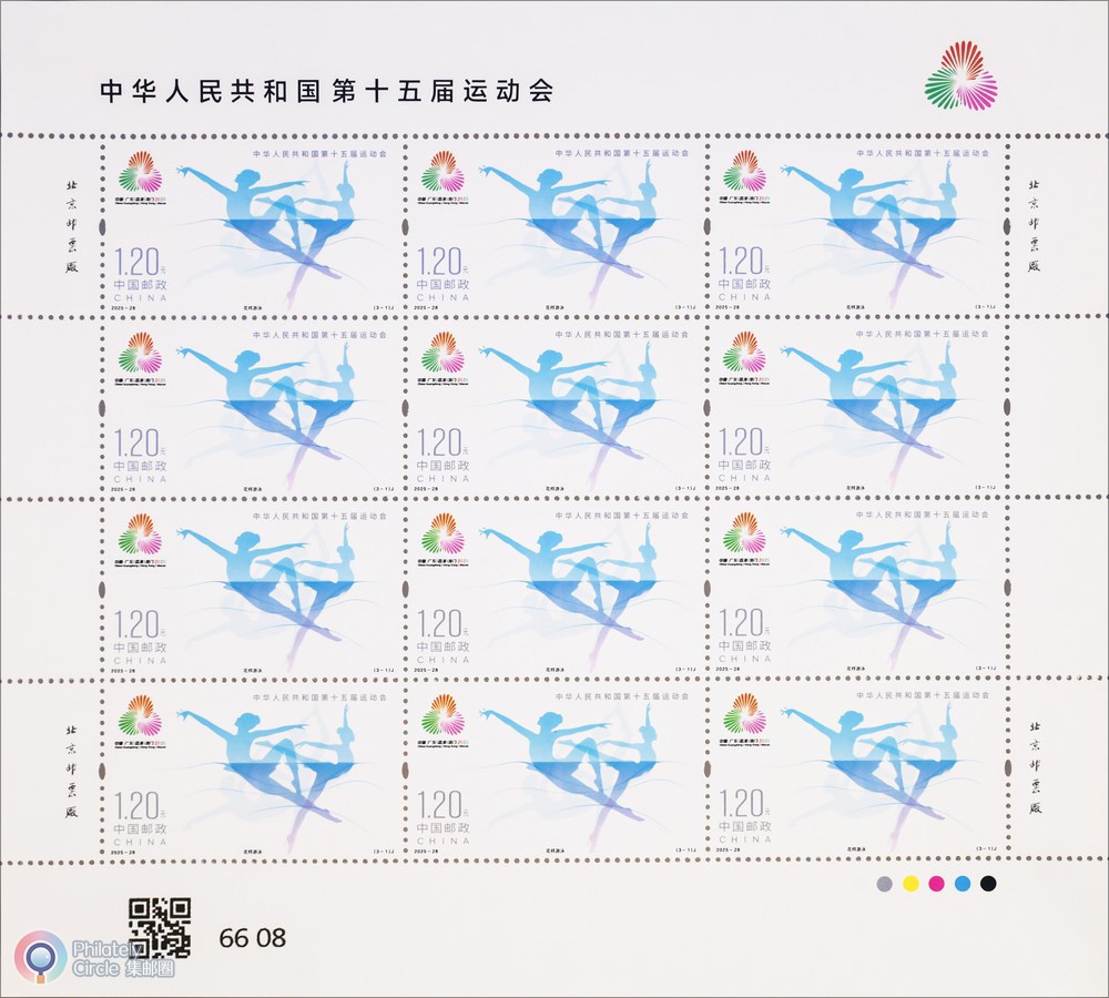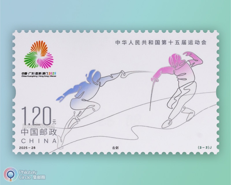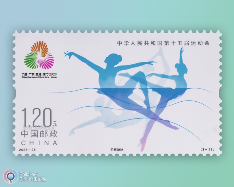 2025年11月9日发行《中华人民共和国第十五届运动会》纪念邮票1套3枚,邮票图案名称为:花样游泳、击剑、乒乓球。全套邮票面值3.60元,计划发行数量为套票500万套,版式二69.3万版。由韩家英、陈幼坚、欧俊轩设计,刘健编辑,北京邮票厂有限公司胶印工艺印制。