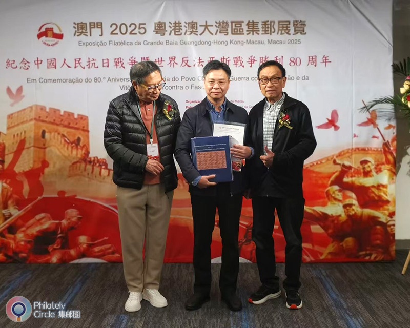 为隆重纪念中国人民抗日战争暨世界反法西斯战争胜利八十周年,2025年澳门粤港澳大湾区邮展于11月20日至23日成功举办。本次邮展以“一份深刻的历史烙印”为主题,旨在追忆烽火岁月,缅怀革命先烈,感受来之不易的和平成就。在中华全国集有联合会、澳門特別行政區文化發展基金、澳门邮电局,为主办邮展活动提供的支持和协助下,国际集邮联主席普拉科,全国集邮联副秘书长黄敏,学术工作部主任成冬青,展览工作部主任谷泽伟出席展览,邮展汇聚了来自各地的珍贵邮集,通过方寸邮票,生动讲述了中华民族的抗战史诗。在备受瞩目的竞赛单元,一批讲述中国抗战史、邮政史的精品邮集脱颖而出,斩获最高荣誉。其中,金奖殊荣由以下几部作品获得:李中东《中国战时首都 远东邮政枢纽——重庆(1937-1946)》,陈山《中国抗战大变迁 (1931-1946)——在邮政上的体现》,张晓钢《二战期间中缅印战区盟军军事邮政》,陆游《沙鱼涌邮政史》1框邮集,傅啸《抗战时期的大湾区邮政史》1框邮集获得金奖。评审委員会由新加坡集邮家蔡国雄先生担任主任,新任中华全国集邮联合会副会长、FIP国际评审孙海平先生、FIAP国际评审李宏、FIAP国际评审霍慧晓、澳门特别行政区评审员梁汝康也担任此次评审工作,何永康和赵康池担任见习评审,余耀强先生担任专家委员。邮展由抗战题材竞赛展品和非抗战题材竞赛展品组成。