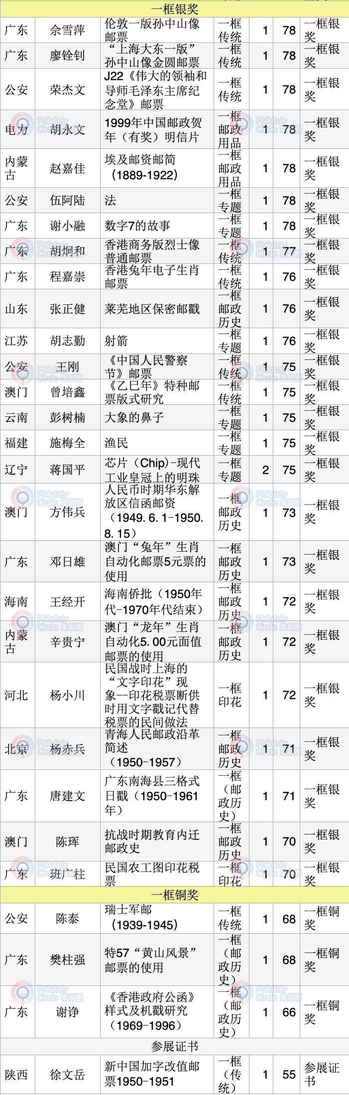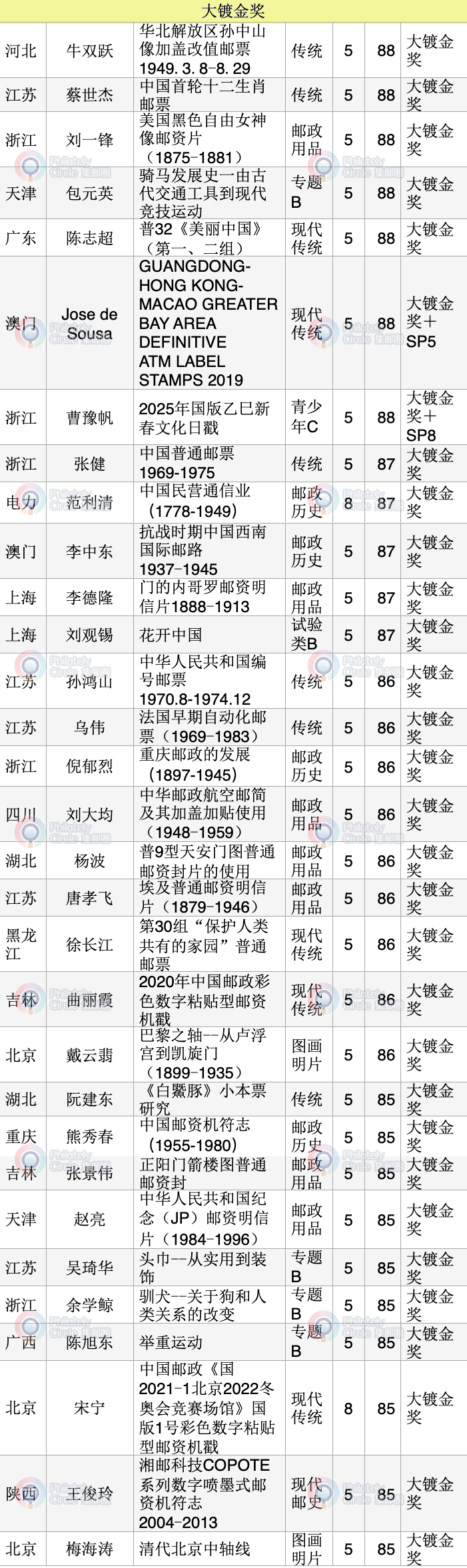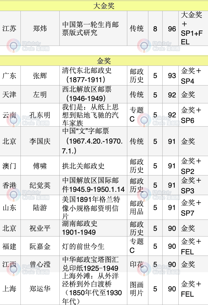 经过各位评审员的严格评审,本届邮展评审委员会按照中华全国集邮联合会集邮展览评审规则,参照国际集邮联合会(FIP)集邮展览评审总规则及各类别评审专用规则和指导要点的评分标准,根据本次邮展评审的特别规则,经过多轮评审,最终确定获奖名单。本届邮展共评出大金奖1部、金奖11部、大镀金奖31部、镀金奖42部、大银奖33部、银奖27部、镀银奖19部、铜奖8部;评出一框金奖3部、一框镀金奖30部、一框银奖25部、一框铜奖4部。郑炜《中国第一轮生肖邮票版式研究》获得唯一大金奖加特别奖加评委会祝贺💐💐💐,金奖邮集中邮政历史拿下4部,传统拿下1部,专题拿下2部,图画明信片拿下1部,印花拿下1部,祝贺各位获奖者,目录已完整上传。