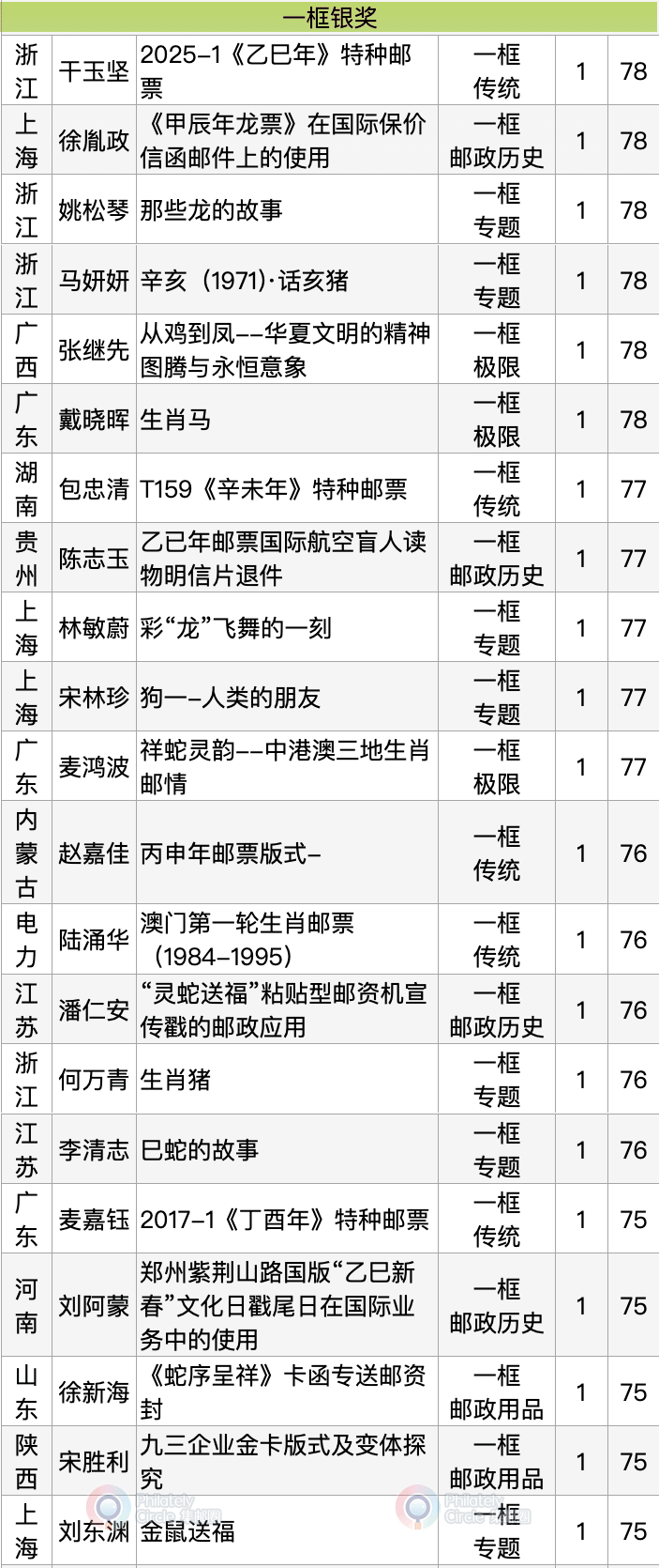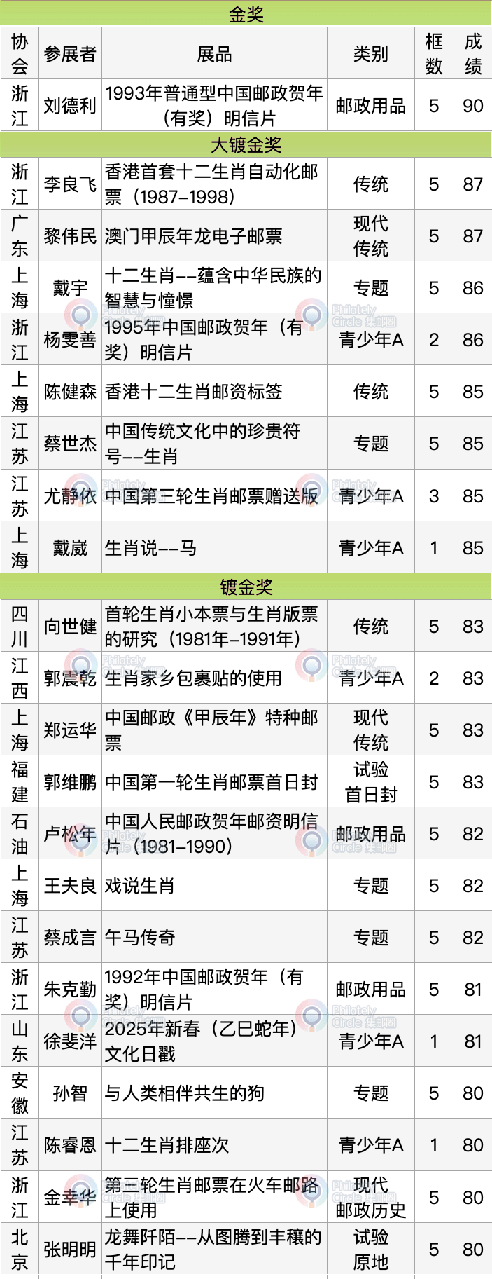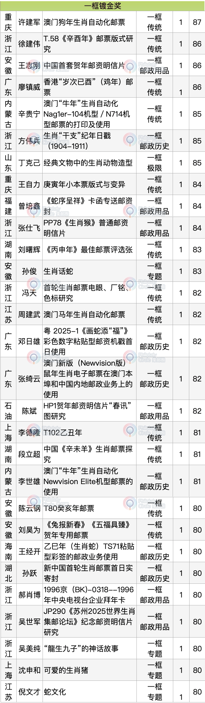 据集邮联消息:第三届中华全国生肖集邮展览评审工作圆满结束。本次邮展为主题性全国邮展,共展出来自全国29个省级集邮协会的竞赛性展品155部302框,类别涵盖传统集邮类、邮政用品类、专题集邮类、极限集邮类、青少年集邮类、一框集邮展品、现代集邮展品、试验集邮类8个类别。本届邮展评审委员会依据《中华全国集邮联合会集邮展览规则》,参照国际集邮联合会(FIP)集邮展览评审总规则及各类别评审专用规则和指导要点的评分标准,根据本次邮展的特别规则,共评出金奖1部、大镀金奖8部、镀金奖14部、大银奖14部、银奖9部、镀银奖8部、铜奖2部;评出一框金奖1部、一框镀金奖29部、一框银奖51部、一框铜奖18部。祝贺各位获奖者💐💐💐