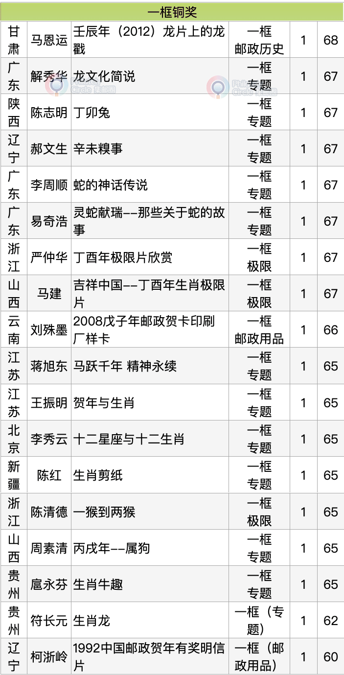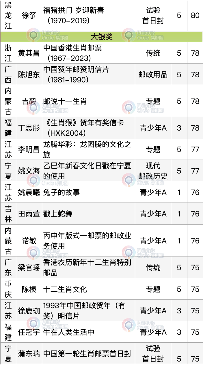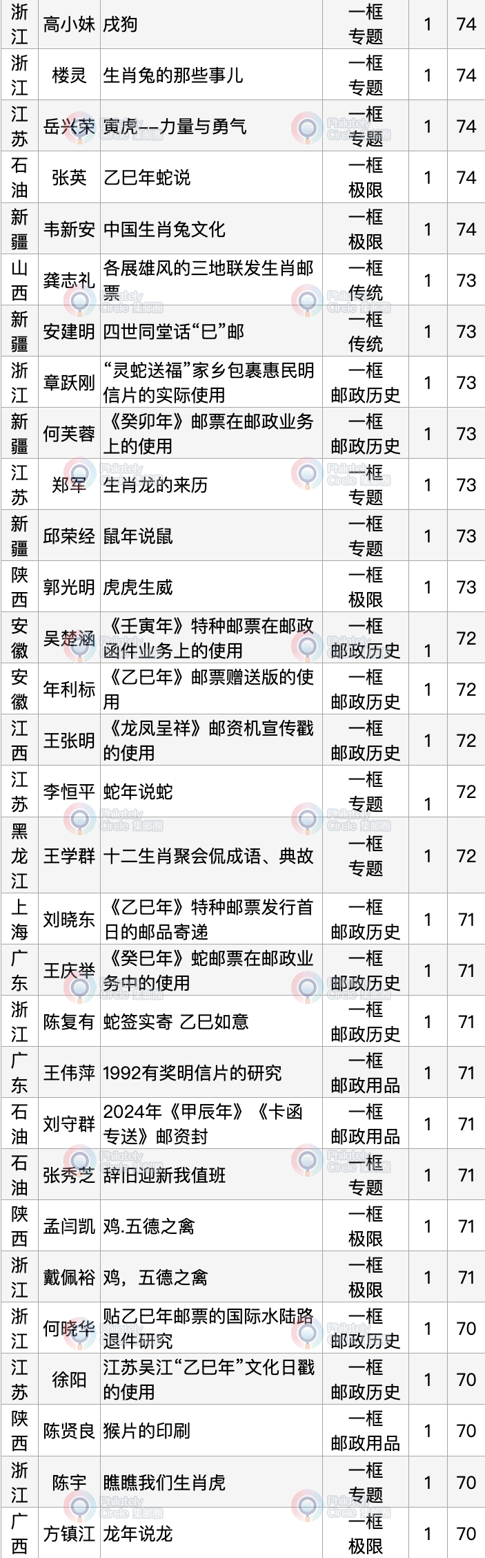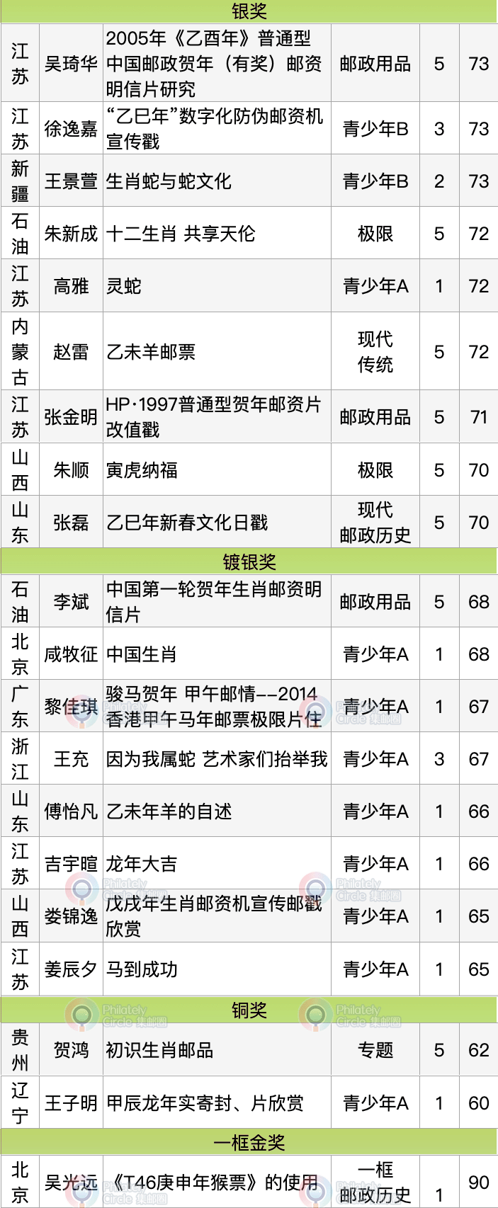 据集邮联消息:第三届中华全国生肖集邮展览评审工作圆满结束。本次邮展为主题性全国邮展,共展出来自全国29个省级集邮协会的竞赛性展品155部302框,类别涵盖传统集邮类、邮政用品类、专题集邮类、极限集邮类、青少年集邮类、一框集邮展品、现代集邮展品、试验集邮类8个类别。本届邮展评审委员会依据《中华全国集邮联合会集邮展览规则》,参照国际集邮联合会(FIP)集邮展览评审总规则及各类别评审专用规则和指导要点的评分标准,根据本次邮展的特别规则,共评出金奖1部、大镀金奖8部、镀金奖14部、大银奖14部、银奖9部、镀银奖8部、铜奖2部;评出一框金奖1部、一框镀金奖29部、一框银奖51部、一框铜奖18部。祝贺各位获奖者💐💐💐
