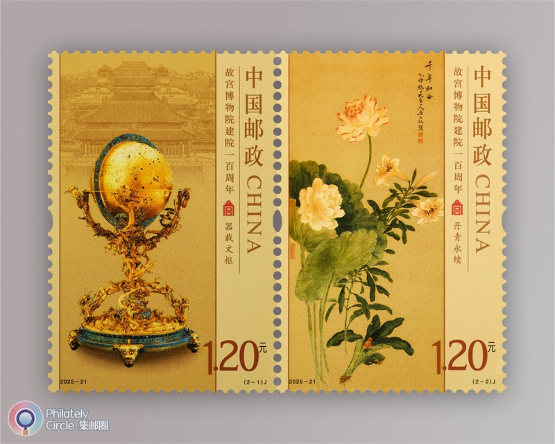 2025年10月10日发行《故宫博物院建院一百周年》纪念邮票1套2枚,邮票图案名称为:器载文枢、丹青永续。全套邮票面值2.40元,计划发行数量为套票490万套,版式二69.3万版。由尹晓飞设计,干止戈编辑,北京邮…