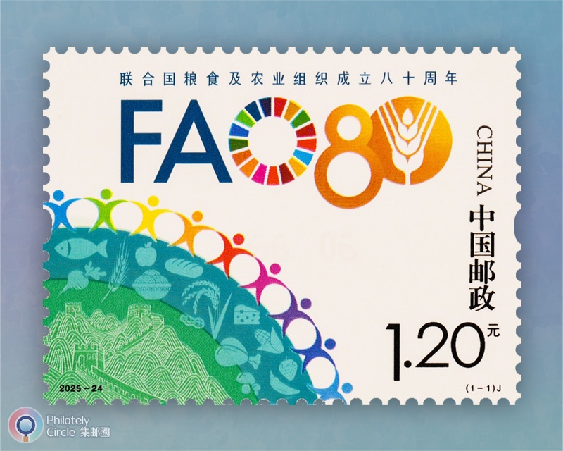 2025年10月16日发行《联合国粮食及农业组织成立八十周年》纪念邮票1套1枚,邮票图案名称为:联合国粮食及农业组织成立八十周年。全套邮票面值1.20元,计划发行数量为460万套。由沈嘉宏设计,及艺璇编辑,北…